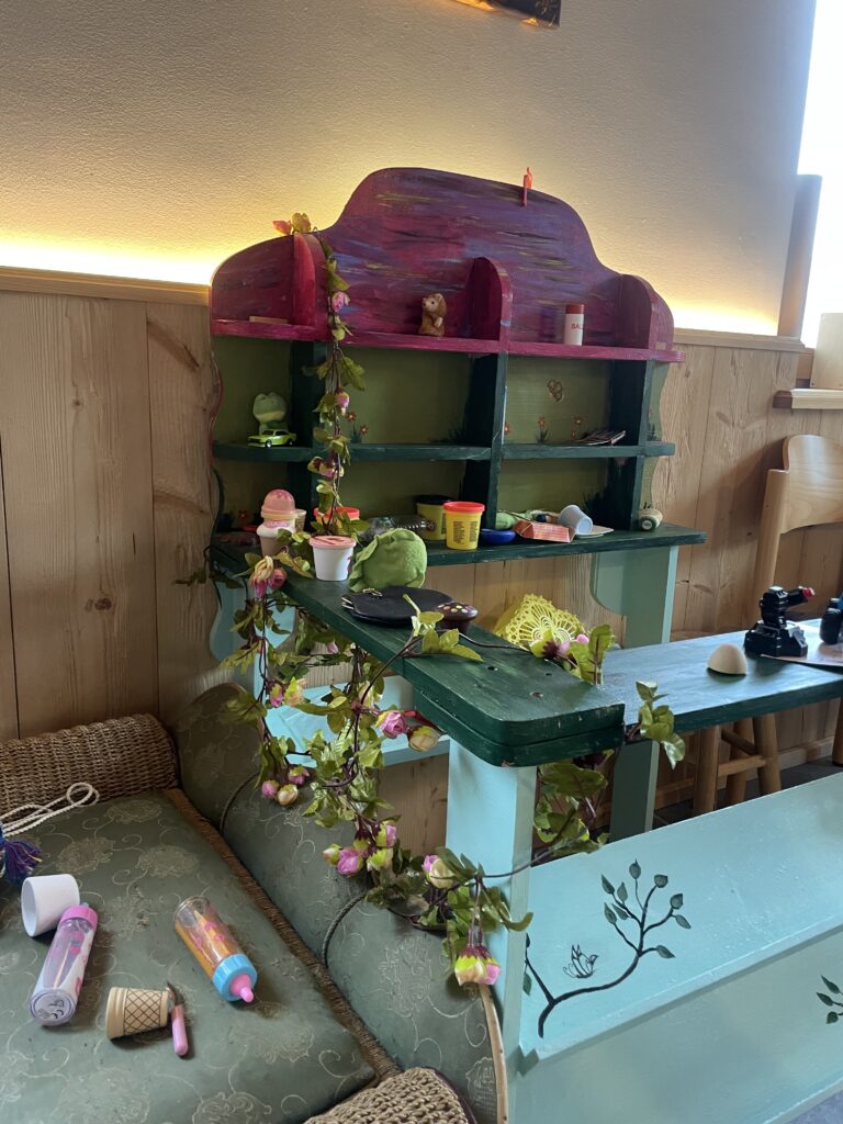 Die Ausstattung der Ferienwohnungen lässt echt keine Wünsche offen, und es hat uns an nichts gemangelt. Es gibt die Möglichkeit, Sprudel, Saft und Quellwasser direkt vom Hof zu beziehen, und ein leckeres Frühstück kann auch wahlweise dazugebucht werden – was wir selbstverständlich getan haben. Und es hat sich gelohnt, schon alleine für das Ambiente. Denn der Frühstücksraum ist wie eine große Wohnküche gestaltet, was direkt einen familiären Flair versprüht. Ein Kamin in der Mitte wird in den Wintermonaten sicher einen noch gemütlicheren Hauch verteilen – und jetzt das Beste: eine großzügige Spielecke mit Mal- und Basteltisch, Knete, Spielküche und Puppenstube lässt Eltern gemütlich fertig frühstücken, während die Kids schon springen können. Also haben wir guten Gewissens die alltäglichen Tischregeln für den Urlaub fallen lassen und ein entspanntes Frühstück genossen.