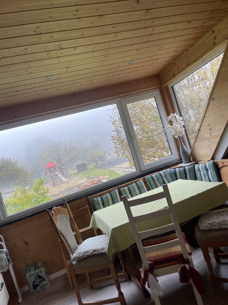 Wir werden herzlich empfangen und dürfen die beiden Ferienwohnungen direkt über dem Stall beziehen. Sie liegen nebeneinander auf einer Ebene ohne weitere Nachbaren, sodass es sich eher anfühlt wie eine große Ferienwohnung und nicht wie zwei getrennte. Perfekt also für Urlaub mit Freunden. Als wir die erste Ferienwohnung betreten, gibt es für mich einen absoluten „WOW“-Effekt. Die große Fensterfront über dem gemütlichen Essbereich bietet uns direkten Blick auf den Abenteuerspielplatz.