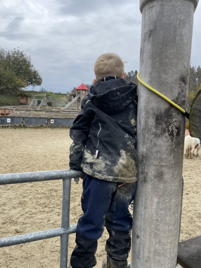 Und so begann Tag 3 mit drei Stunden Ponycamp für die Mädels: Stall misten, Ponys putzen, pflegen, geführtes Ponyreiten – und strahlende Kinderaugen. Was ein Traum! Und nun kam der nächste Knüller: Es war Zeit für zwei Reitstunden. Da wurde natürlich nicht lange überlegt und zugesagt. Im Anschluss durften alle Kids von uns – die sitzen können 🙂 – noch eine geführte Ponyrunde auf dem Reitplatz drehen. Und ein bisschen Spaß muss sein, dachte sich die Haferhorde. Denn plötzlich wehten weiße Mähnen am Spielplatz vorbei! Die fleißigen Ponys machten ihrem Ruf alle Ehre und büxten aus, sodass noch eine actionreiche Pony-Einfangjagd eröffnet wurde.